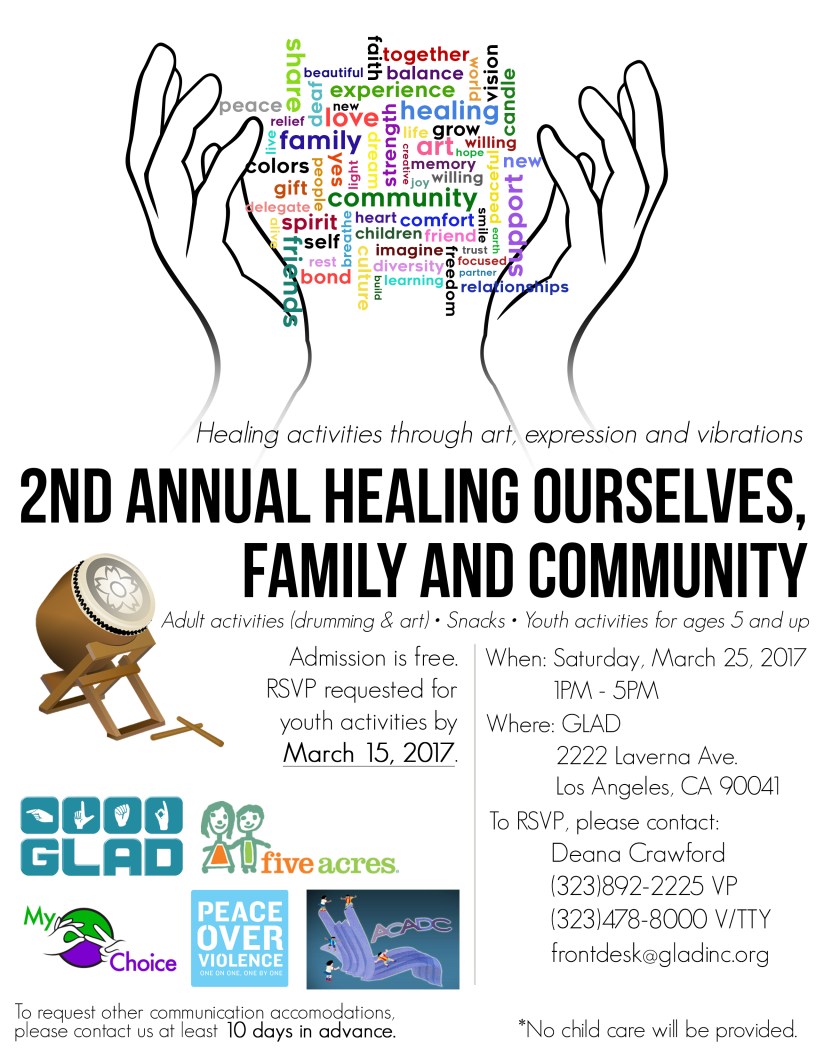 Join us on Saturday, March 25, 2017 from 1PM – 5PM at GLAD for our 2nd Annual Healing Ourselves, Family and Community. The theme is “healing activities through art, expression and vibrations.”