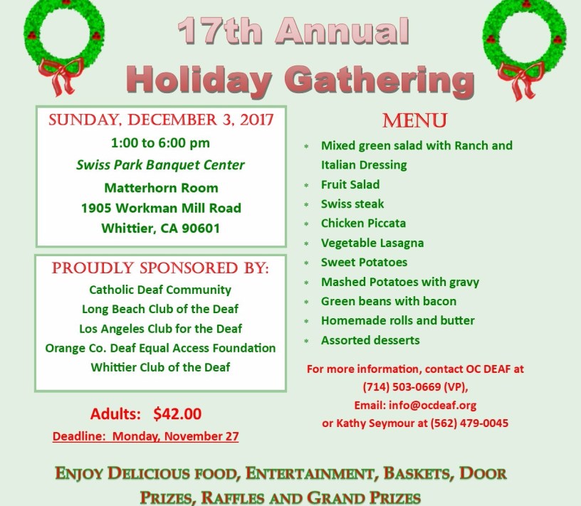 Seasonal Event 17th Annual Holiday Gathering (Whittier) – Sunday, December 3, 2017 – 1 to 6pm. Date: November 21, 2017Author: Deaf.LA 0 Comments Location: Swiss Park Banquet Ctr, Whittier Tickets: $42. See link for reservation form: (Deadline Nov. 27) Share this: Click to share on X (Opens in new window) X Click to share on Facebook (Opens in new window) Facebook Like Loading...