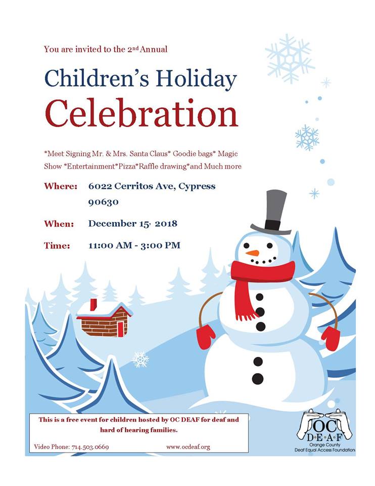 Seasonal Event 2nd Annual Children’s Holiday Celebration (Cypress) – December 15, 2018 – 11:00 to 3:00 Date: November 26, 2018Author: Deaf.LA 0 Comments Location: OC DEAF, Cypress, CA This event is for deaf and hard of hearing families. Share this: Click to share on X (Opens in new window) X Click to share on Facebook (Opens in new window) Facebook Like Loading...